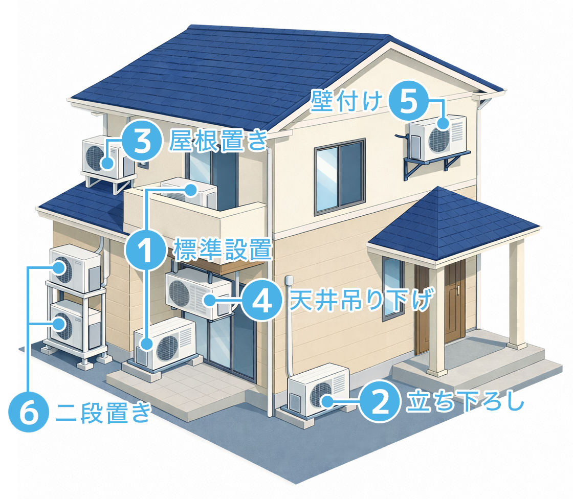 室外機の置き場所が①・②以外となる場合は、特殊工事が必要となります。